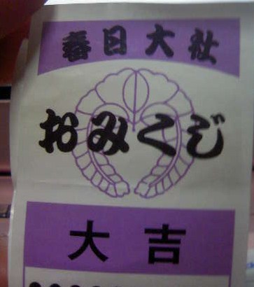 去年は普通のおみくじにしたんですが、今年は鹿みくじってのにしました。木彫りされた鹿さんがおみくじをくわえてるのです。鹿付きだし。よし、奮発だ。とかおもって、いざいざ!
